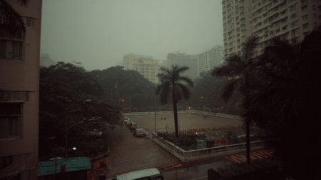 A dark and atmospheric view of a city during a downpour. An overcast sky looms over wet streets, buildings, and a solitary palm tree, creating a moody, somber scene.