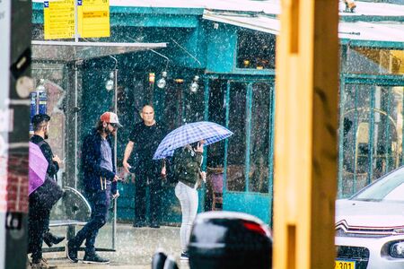 Tel Aviv Israel February 19, 2020 View of unidentified people walking in the streets of Tel Aviv during a raining day in winter