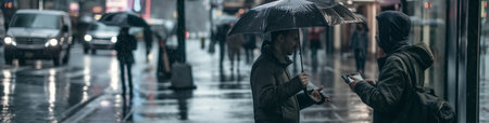 Urban Scene in Rainy Weather Street Life, Conversation, and Umbrellas in Cityscape.