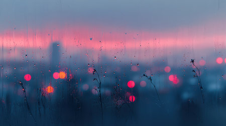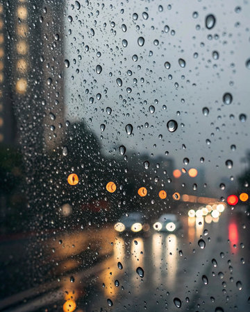 Raindrops clinging to a foggy window, blurring city lights in the background, evoking a nostalgic and contemplative atmosphere on a rainy evening.
