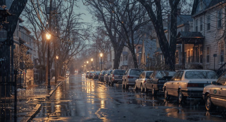 A quiet residential street during rainfall, with water pooling on the road and creating reflective surfaces of the surroundings.
