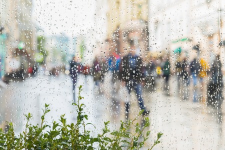 Abstract background of blurred young people walking down the street in rainy day. Raindrops on window glass. Intentional motion blur. Concept of modern urban lifestyle