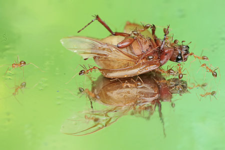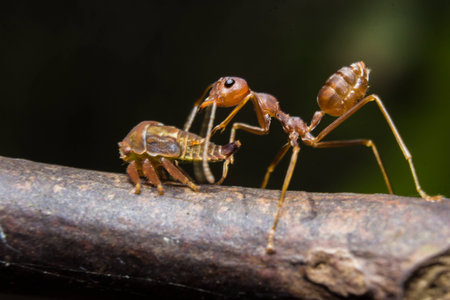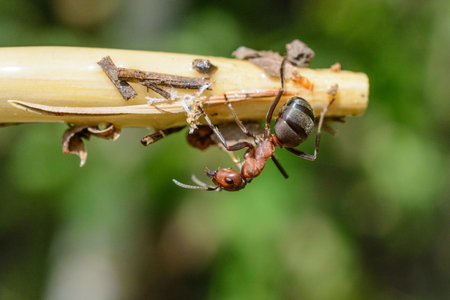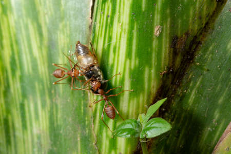 Red Ant bridge unity team. Close up Macro of Ant making unity bridge on plant with nature forest green background. Ant action standing.