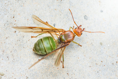 Green ant queen with orange head and thorax and transparent wings is standing on a white surface, showing its colorful body and delicate wings