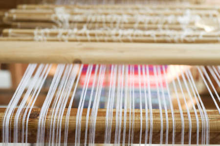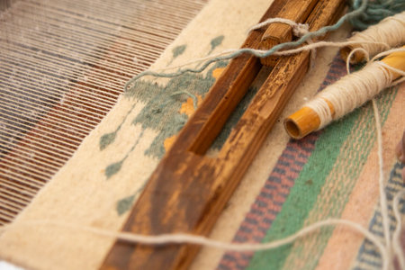 Close-up of ancient traditional hand weaving loom or weaving machine, selective focus