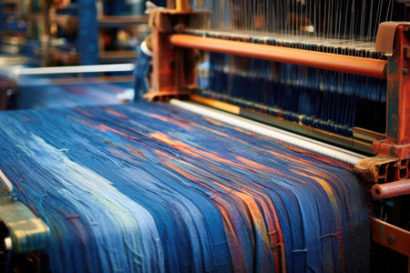 denim fabric being woven on industrial loom, created with generative ai