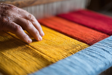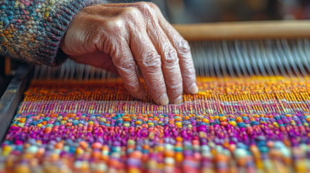 Hands of an elderly artisan skillfully weave a vibrant textile, showing intricate patterns and colors in a warm, inviting space full of creativity.