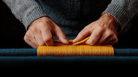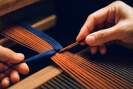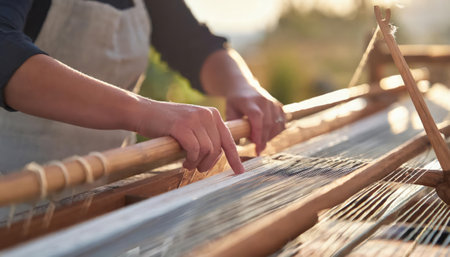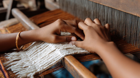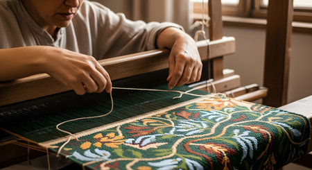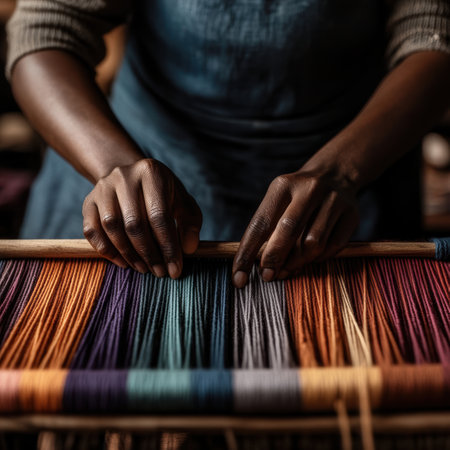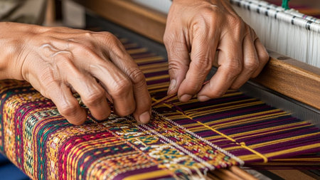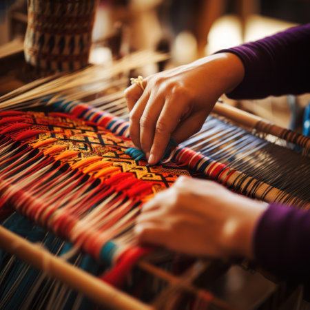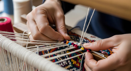 Skilled hands work meticulously at a loom, creating a vibrant textile. Threads of various colors blend together, showcasing artistry and craftsmanship in a cozy workshop.