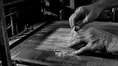 This black and white photograph captures the intricate details of an artisan's hands skillfully weaving textiles on a traditional loom, showcasing the beauty of manual craftsmanship.
