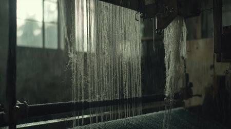 An atmospheric view of an industrial textile machine, showcasing water streaming over threads in a dimly lit factory. The scene evokes nostalgia and craftsmanship.