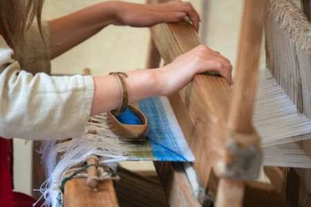 textile weaver craftsman making products on a wooden handicraft loom