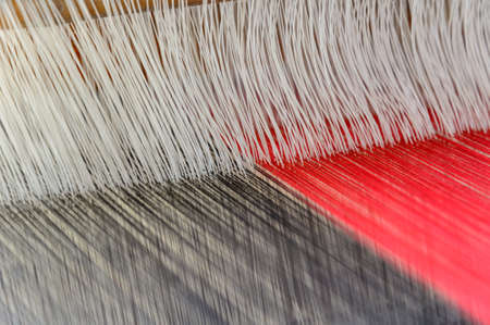 Close up of Thai Silk weaving on a traditional loom. Close up Thai silk thread. Making of thai silk. shallow depth of field