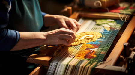 Master weaver is weaving the tapestry with diverse bright threads, close up. Artisanal at work. AI Generated