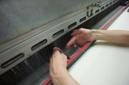hand working with white strings in the txtile industry