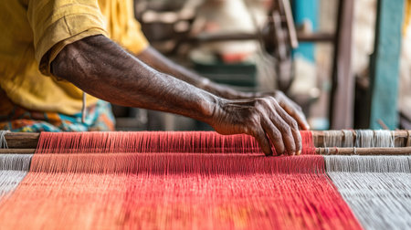 Close up of artisan's hands weaving silk fabric on a traditional handloom, creating an intricate textile pattern