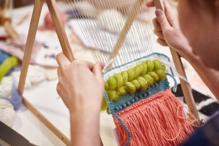 Master weaver is weaving the tapestry with diverse bright threads, close up. Artisanal at work