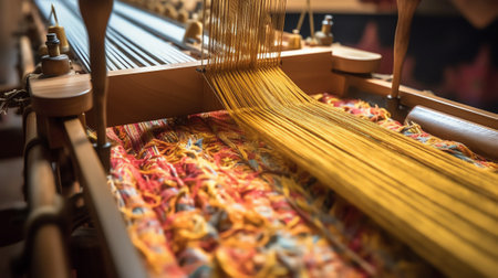 This image captures the intricate weaving process on a traditional loom, highlighting the artistry and craftsmanship of textile creation. The patterned fabric showcases the rich cultural heritage behind this timeless art form.