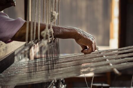 Blurry images. The hand of an elderly woman who is picking up the yarn is a gesture of traditional Asian weaving.