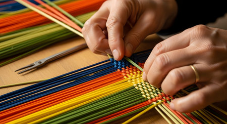 A close-up of a person's hands skillfully weaving colorful plastic or reed strands into a pattern. The strands are rainbow-colored (blue, yellow, green, orange), and a small metal tool rests nearby. This image represents traditional crafts, weaving, and handmade artistry.