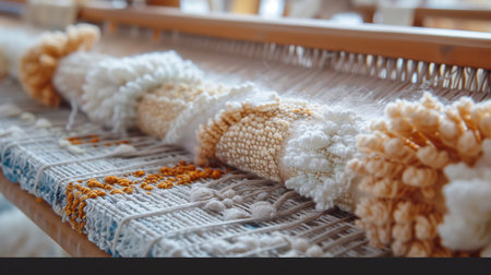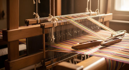 Weaving colorful threads on a loom in a cozy workshop during the day