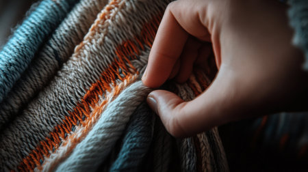 A close-up of a hand gently touching vibrant threads on a loom, showcasing the art of weaving. The image highlights the intricate textures and colors involved in the looming process. ai generated.