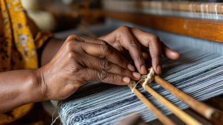 A woman is weaving a piece of fabric with her hands. Concept of patience and dedication as the woman carefully works on her craft