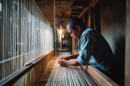 Focused Artisan Weaving at Loom Skillful Textile Creation in Modern Workshop.