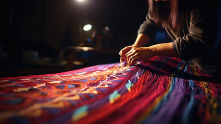 Craftsmanship comes to life as skilled hands meticulously weave colorful threads in a traditional Mexican market. Each strand of vibrant yarn reflects the rich culture and artistry of the region.