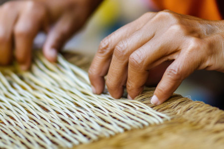 Close up of skilled hands weaving natural fibers into a beautiful basket, highlighting craftsmanship and artistry in traditional weaving techniques