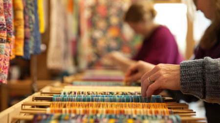 A lively demonstration of textile art is underway with fiber artists weaving colorful threads on looms. The softly blurred backdrop of fabric samples and hanging art adds depth to th