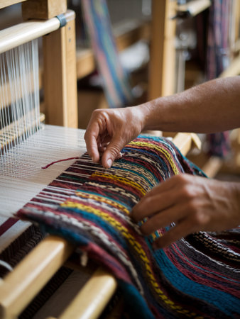 Artisan weaving colorful threads on traditional loom, innovative production
