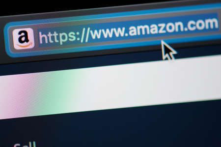 New-York , USA - April 29 , 2020: Amazon url link adress website close up view on laptop screen
