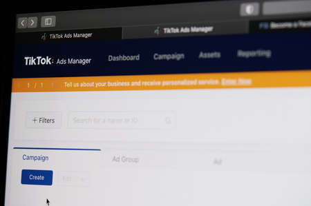 New york, USA - October 23, 2020: Create ad campaign in tiktok screen display close up view