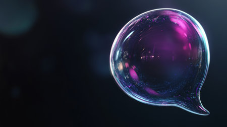 Iridescent speech bubble in dark space with vibrant colors and reflections. Digital communication and futuristic design concept