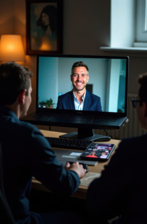 Two businessmen are having a video conference call with a smiling manager on a computer in a modern office, using a laptop and other devices for a productive remote meeting