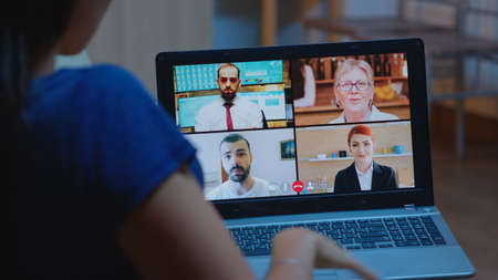 Back view of woman sit at desk at home have webcam conference on laptop computer with business partner or client. Work from home concept