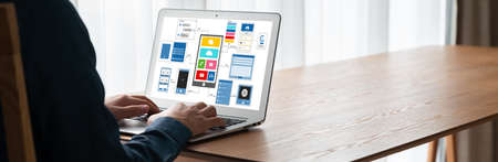 Developing programming and coding technologies with Website design in virtual diagram.cyber security internet and networking concept.Businessman hand working mobile phone on laptop computer background