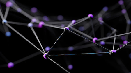 Digital network illustration showcases interconnected nodes and lines in purple on a dark background, emphasizing technology, connectivity, and modern design elements