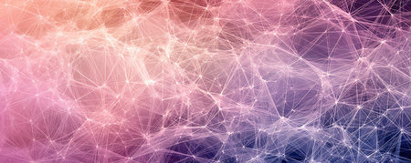 Abstract panoramic display of a stylized digital network, presented as interconnected nodes in soft, pastel thulian pink hues