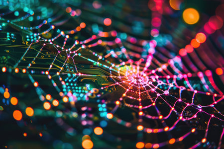 Close up of electronic circuit board with colorful bokeh light background.