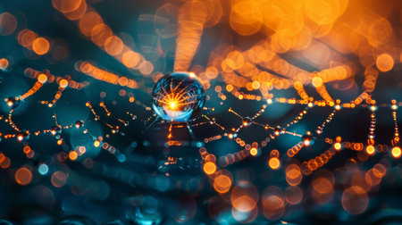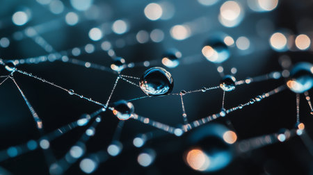 An AI generated illustration of a macro shot of a delicate spider web covered in dew droplets