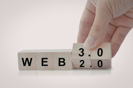 A hand is shown arranging wooden blocks to spell out 'WEB 3.0' and '2.0', representing the transition from Web 2.0 to Web 3.0.