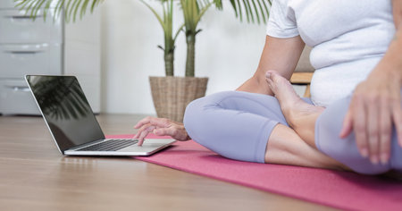 Elderly Woman Practicing Yoga at Home Using Online Classes on Laptop, Embracing Healthy Lifestyle and Modern Technology