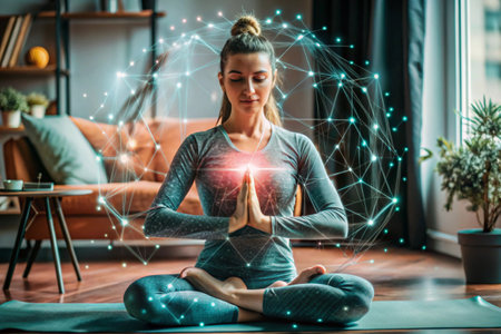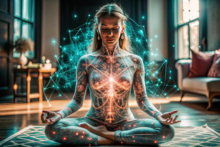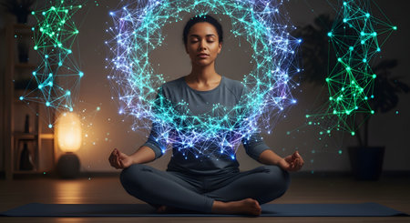 A calm woman sits in the lotus pose on a yoga mat, meditating with her eyes closed in a dimly lit room. A glowing, futuristic plexus of blue and green light, representing a neural network or digital consciousness, surrounds her.