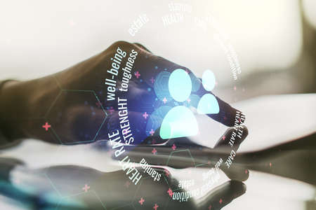 Creative abstract people icons sketch and hand working with a digital tablet on background, life and real estate insurance online concept. Double exposure