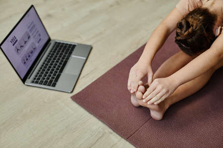 Top view at teenage girl doing stretching exercises while enjoying yoga at home via online lesson