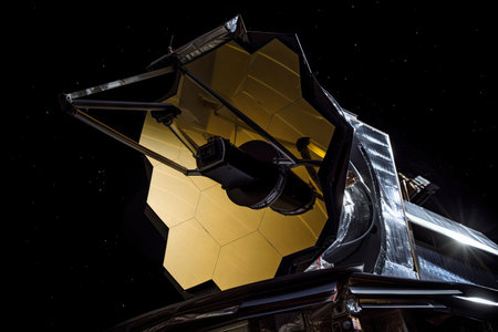 close-up of space telescope, with the stars shining in the background, created with generative ai