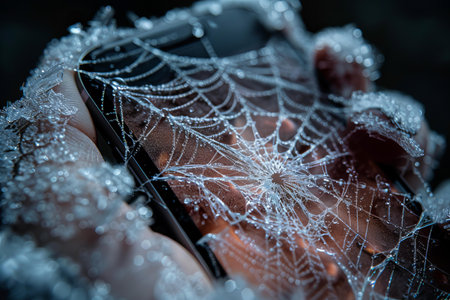 Close-up of a woman's hand holding a mobile phone with a spider web on the screen