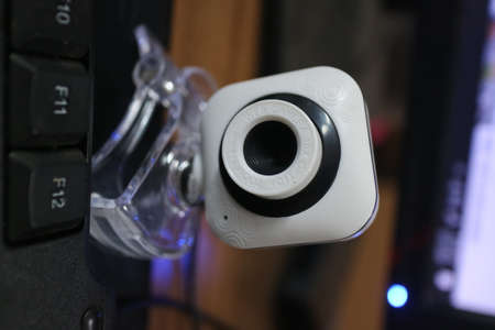 Webcam above computer screen. White webcam above black screen. Digital security concept