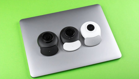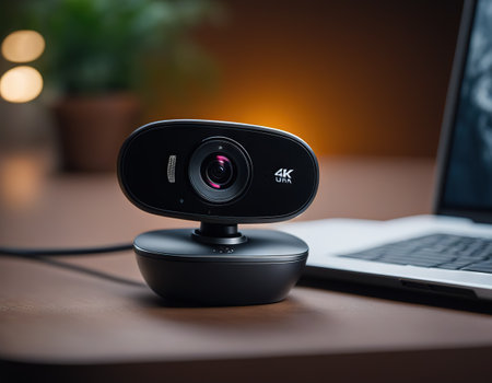 A sleek, futuristic webcam with a glowing blue AI-powered lens stands ready. It represents the cutting edge of digital communication, online security, and the ever-watchful eye of modern technology in an interconnected world.